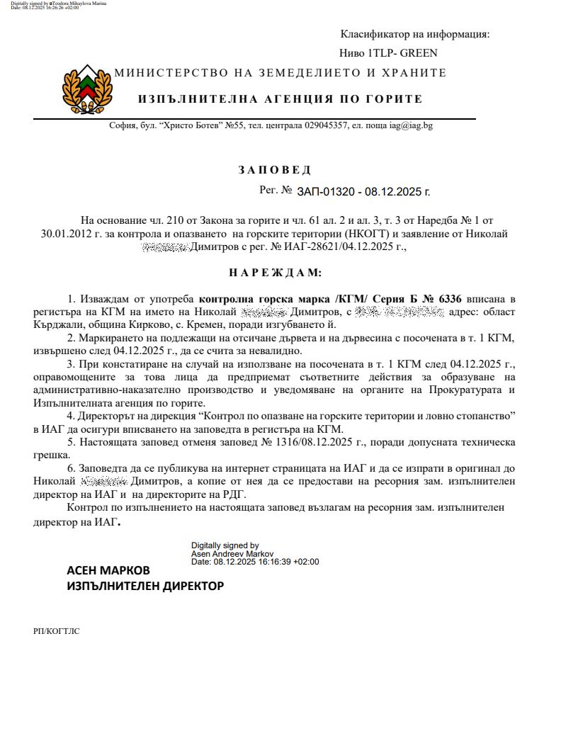 Заповед № 1320/08.12.2025 г. на изпълнителния директор на ИАГ за изваждане от употреба на контролна горска марка