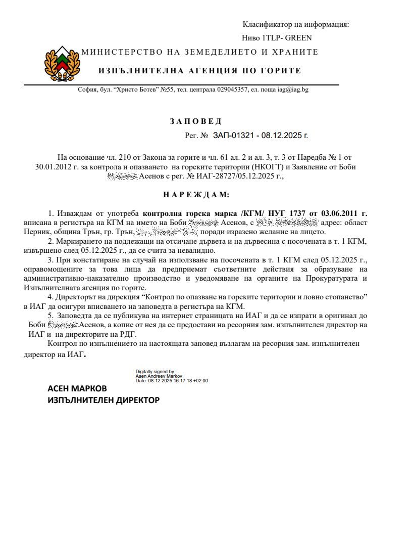 Заповед № 1321/08.12.2025 г. на изпълнителния директор на ИАГ за изваждане от употреба на контролна горска марка
